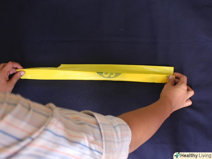 Зігніть пакет майже наполовину по ширині (згин повинен проходити перпендикулярно відрізаному нижньому шву). Залиште з одного краю смужку шириною приблизно 2,5 сантиметра. Зігніть ту частину, яку Ви вже зігнули, ще наполовину. Продовжуйте згинати цю частину пакета знову і знову, поки у вас не вийде смуга шириною близько 2,5 см.