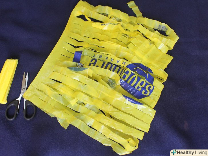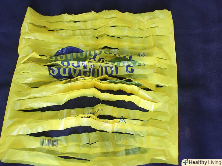 Останній розріз буде схожим з першим і дійде до згину посередині вільного краю. ваш поліетиленовий пакет перетворився на суцільну, довгу, тонку поліетиленову стрічку.