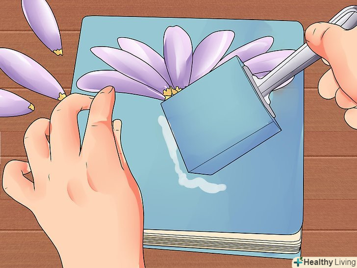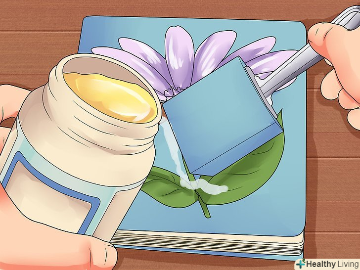 Починаючи з передньої скоринки щоденника, обклейте його обкладинку прикрасами за допомогою клею для декупажу. притримуючи паперові елементи незнаною рукою, нанесіть тонкий шар клею на всю поверхню передньої скоринки за допомогою губчастої кисті. Залиште його на пару годин підсохнути, а потім переверніть щоденник на іншу сторону, щоб прикрасити задню скоринку (не можна допустити, щоб передня сторона при цьому приклеїлася до столу). Переконайтеся в тому, що обидві сторони щоденника висохли, перш ніж продовжувати роботу.- Що стосується клею для декупажу, то він просто створений для декорування виробів. Це просто якесь диво в баночці. Якщо у вас його ще немає, обов'язково купіть собі баночку з ним. Він буде корисний і для багатьох інших проектів, тому ви обов'язково знайдете йому застосування.