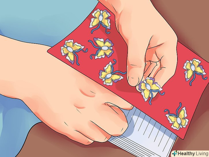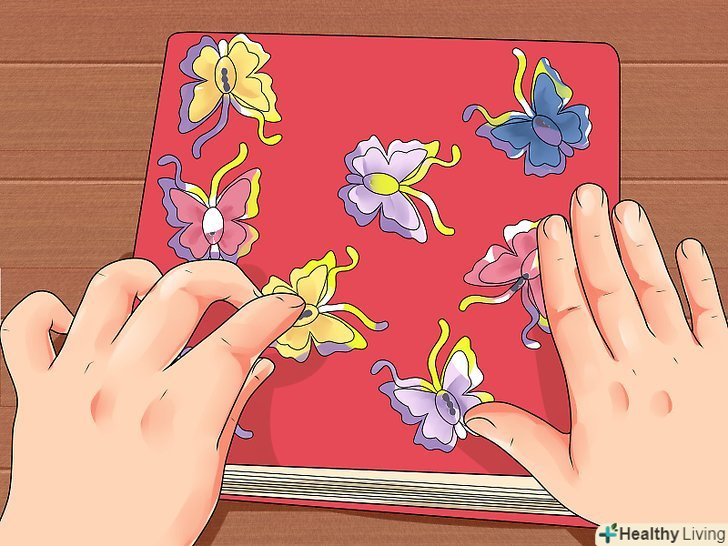 Прикрасьте лицьову сторону обкладинки. ви не дарма обмірковували дизайн обкладинки заздалегідь. Тепер настав час прикрасити її лицьову сторону (саме до пришивання кишеньок). Тому переходите до пришивання і наклеювання всіх необхідних вам декоративних елементів. Якщо ви також хочете прикрасити тильну сторону обкладинки, зробіть і це.- Якщо ви користувалися матеріалами, які вимагають сушіння, обов'язково дайте їм достатньо часу на те, щоб висохнути, перш ніж продовжувати роботу далі. В іншому випадку можна все зіпсувати і забруднити руки.
