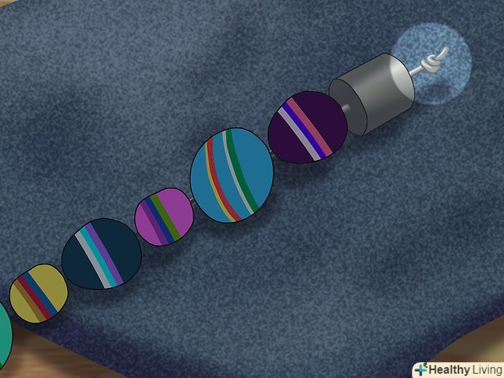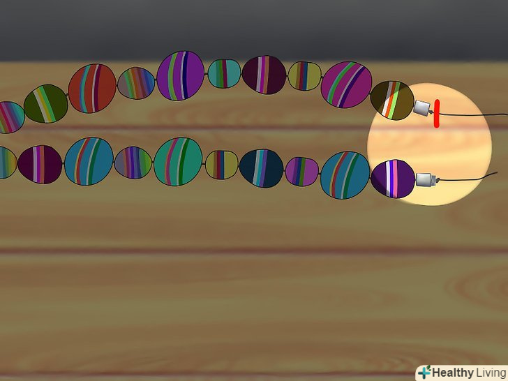 Нанизуйте намистини відразу на тросик. Якщо ви використовуєте тросик, вам не знадобиться голка – намистини з легкістю будуть нанизуватися самі. По черзі надягайте намистини на тросик, що не відкріплюючи його від котушки. Якщо вам знадобиться більше довжини, це не буде проблемою. Але будьте обережні і не тисніть на свій виріб. Незважаючи на те, що намиста абсолютно нові, вони все одно можуть деформуватися.- Коли ви закінчите нанизувати намистини, подивіться на виріб. Всі намистини розташовані в правильному порядку? Воно достатньої довжини?