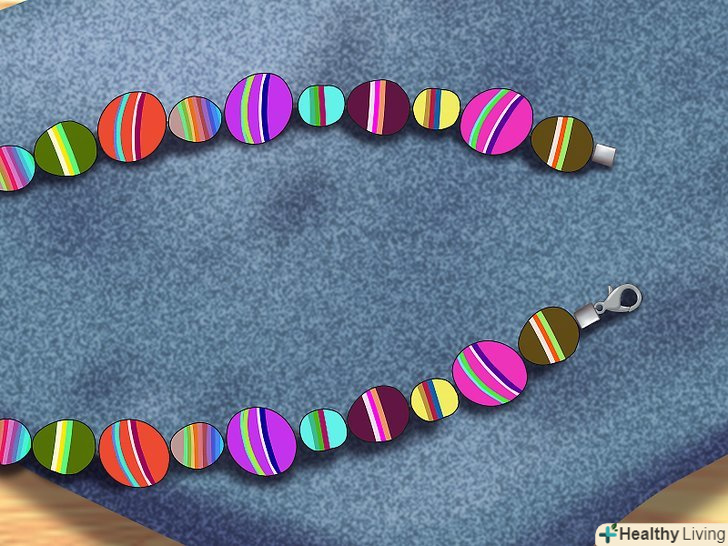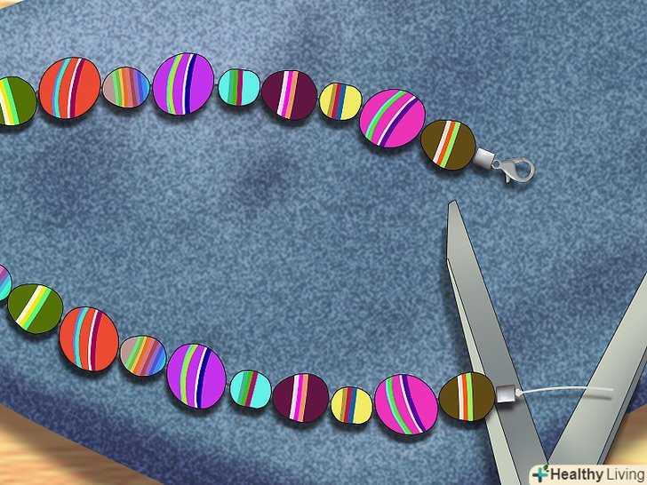 В кінці відріжте зайвий кінець нитки. Зв'язавши вузлики з боків кожної намистини, відріжте крайній вузлик, який ви недавно зробили. Потім протягніть кінець однієї нитки через другу половинку засувки. Щільно підсуньте засувку до вузла за останньою бусиною і зав'яжіть хороший, міцний подвійний вузол.