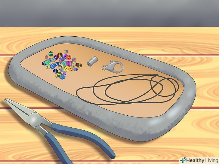 Запасіться всім необхідним. найкраще зробити все за один день, щоб намистинки від вас дивним чином не покотилися. Ось все, що вам знадобиться:- Тросик і засувка. для більшості виробів найкраще підходить Ювелірний (біжутерний) тросик з нейлоновим покриттям. Він є в магазинах для рукоділля і продається мотками різної ваги, міцності і кольорів. Не піддайтеся спокусі використовувати нитку: вона з часом може протертися і порватися, і вам знову доведеться повернутися до цієї статті в майбутньому.