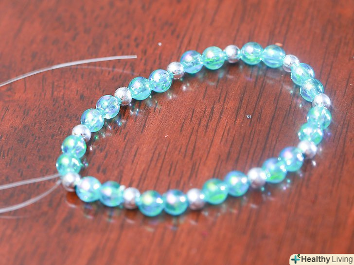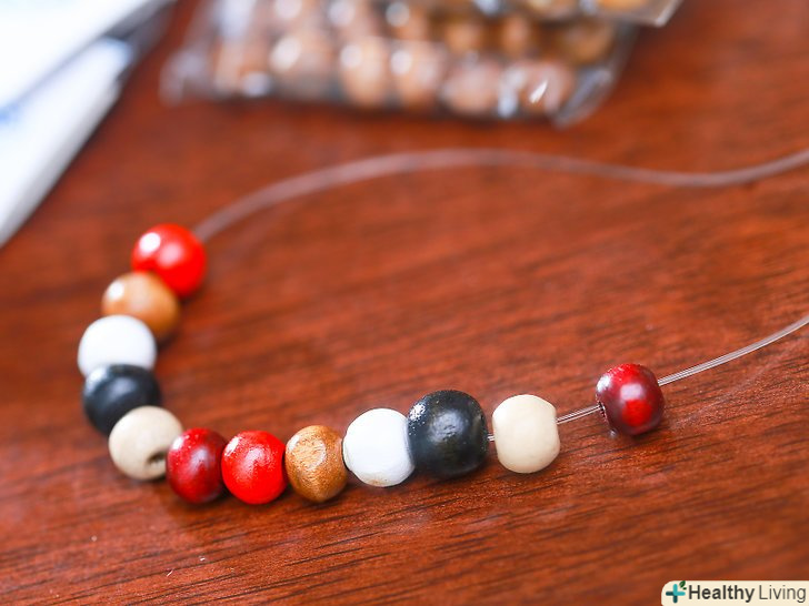 Нанизуємо кульки в перший ряд. Зав'яжіть вузол на одному кінці волосіні (залишаючи невеликий хвостик) і почніть нанизувати намистинки. Зазвичай використовують 25-30 намистин, але вам буде хотітися, щоб манжет був досить великий, щоб ковзати по зап'ясті туди і назад і не був занадто вільним.