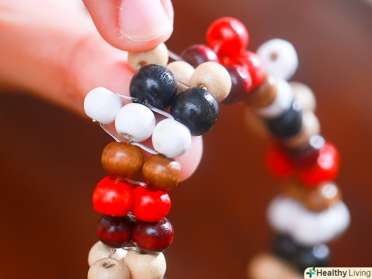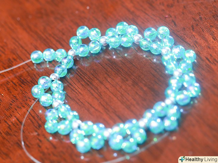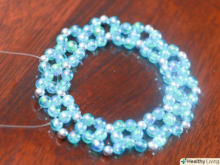 Робимо другий ряд. щоб зробити другий ряд, вам треба додавати кульки на волосінь, а потім протягувати волосінь через перший ряд, щоб сплести ряди разом. Протягніть три намистинки на довгу волосінь, а потім протягніть її через сусідній кульку в першому ряду. Додайте наступні три кульки і простягніть волосінь через поруч стоїть кульку в першому ряду. Продовжуйте так робити, поки не закінчиться волосінь, а потім зав'яжіть надійний вузлик на кінці.