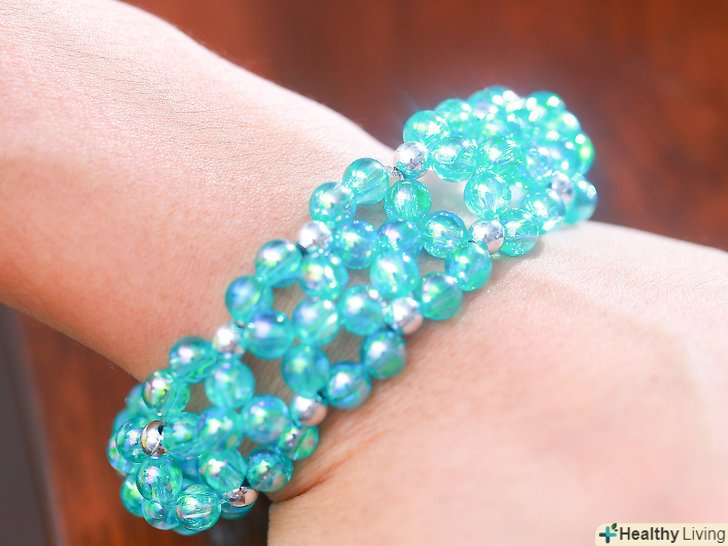 Додаємо третій ряд з кульками. використовуйте таку ж технологію додавання намистин в третій ряд, як і для другого. На цей раз вам не треба зав'язувати волосінь у вузол, але продовжуйте нанизувати кульки, щоб заповнити простір. Одягніть кульку на волосінь, де є розрив, а потім прикладіть його до манжети, протягуючи волосінь через відповідний кульку в першому ряду. Робіть так, поки не отримаєте всі готові ряди з намистин і зав'яжіть волосінь.
