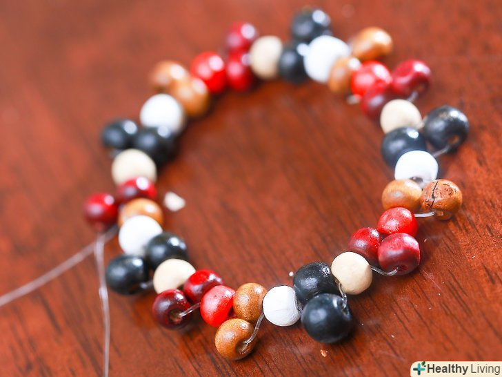 Робимо перший ряд. оберніть волосінь навколо зап'ястя, щоб позначити довжину манжети, потім на кінці зав'яжіть вузол (залишаючи невеликий хвостик). Додайте кульки будь-якого кольору на ваш вибір, туго натягуючи їх на вузол на кінці. Коли кульок буде достатньо, щоб обернути навколо зап'ястя, зав'яжіть два кінці разом і протягніть довгий кінець хвостика через намистинку поруч з вузлом.