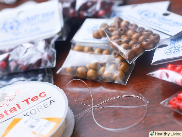 Підготуйте матеріали. Назва х-манжета пішла від Х-форми манжети, яка з'являється в кінцевому підсумку. Так як вона широка, потрібно більше волосіні і бус, ніж для звичайної манжети. Вона буде більш привабливою, якщо ви використовуєте різні кольори намистин. Крім цього, вам знадобиться котушка еластичною волосіні, поні намистинки на ваш смак і ножиці.
