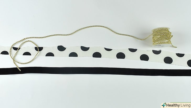 Приготуйте тканину і кулькову ланцюжок. для створення богемного шику добре підійде бавовняна тканина з квітковим візерунком. [9] для більш помітного стилю спробуйте взяти кольоровий шнур і смужку шкіри. [10] кулькові ланцюжки бувають як сріблястими, так і золотистими, тому виберіть той варіант, який найкраще впишеться в використовувану вами колірну схему.- Кульковий ланцюжок можна знайти в магазині товарів для рукоділля у відділі бус і бісеру. Також можна не купувати ланцюжок, а взяти її з якогось старого Кольє.