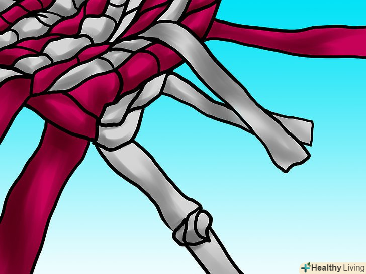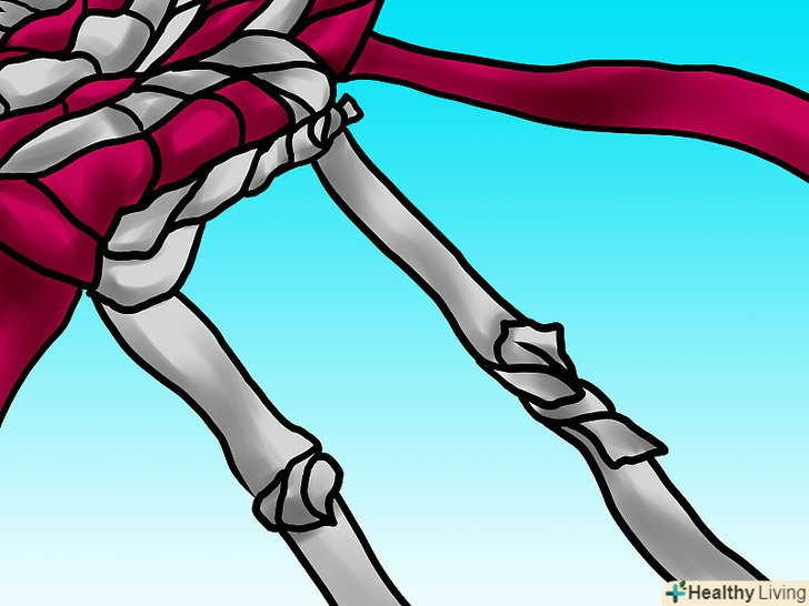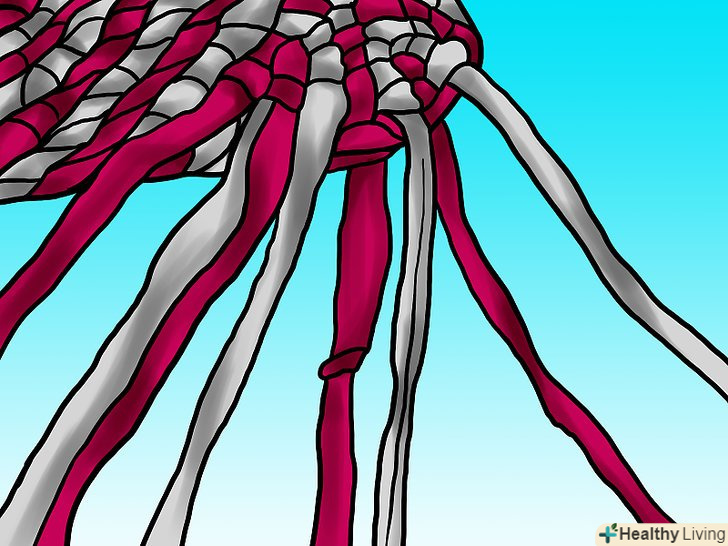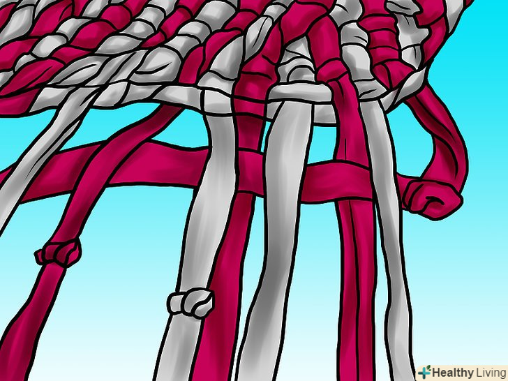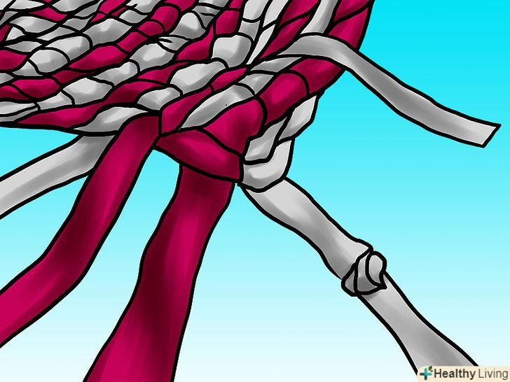 Зв'яжіть дві смужки простим слабким вузлом. потім вам доведеться протягувати тканину через нього, так що не робіть його занадто тугим – це буде вельми прикро. Також зверніть увагу, що на зображенні смужки мають різну довжину. До кінця кожної вам потрібно буде приєднувати наступну, так що краще, якщо місця з'єднання будуть чергуватися.