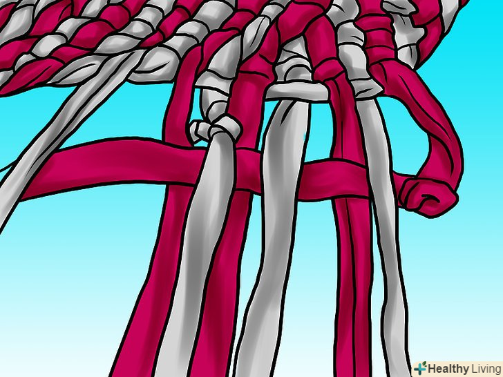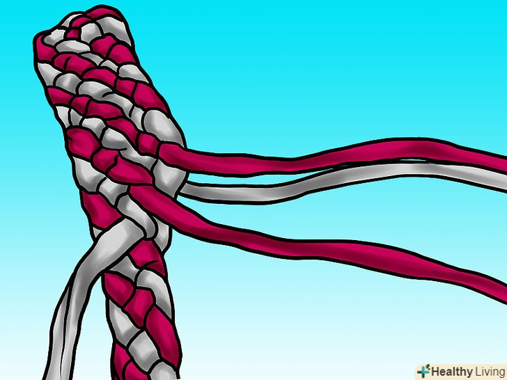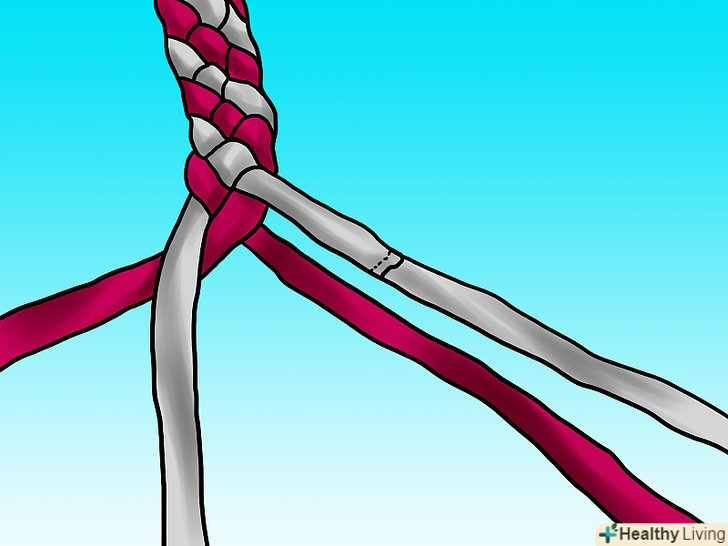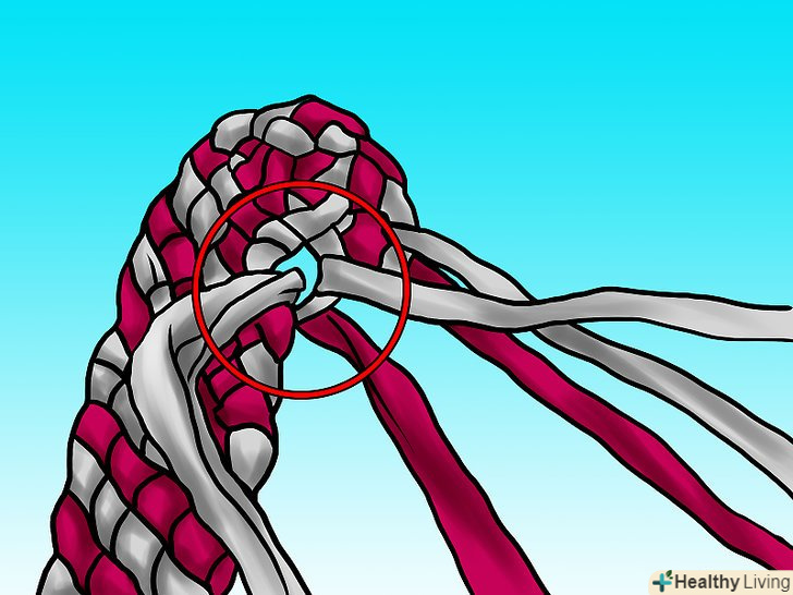 Продовжуйте тим же чином: беріть смужку справа і плетіть під низ, поверх, під низ. зауважте, що вам не потрібна туга косичка. Затягуйте смужки лише настільки, щоб плетіння лежало рівно і зберігало форму.