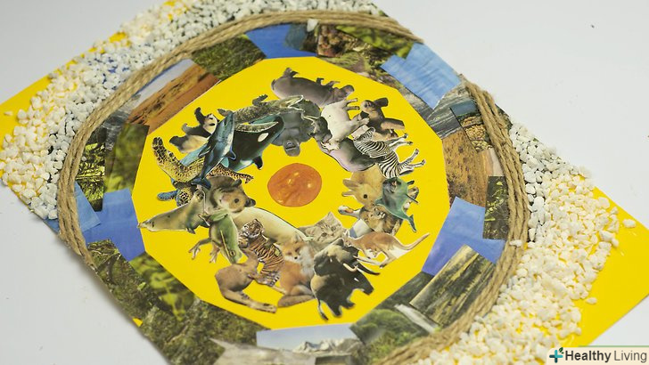- Включіть в колаж прикрашають елементи (наприклад, стрічки), щоб зробити його більш яскравим. незважаючи на те, що прикраси не відносяться до критично важливих елементів, при бажанні в колаж можна включити досить багато унікальних предметів. Пір'я, стрічки і клапті тканини — лише малий список потенційно можливих матеріалів. Розподіліть їх навколо зображень в манері, що відповідає тематиці колажу, або просто використовуйте їх в якості додаткового декору. [7]