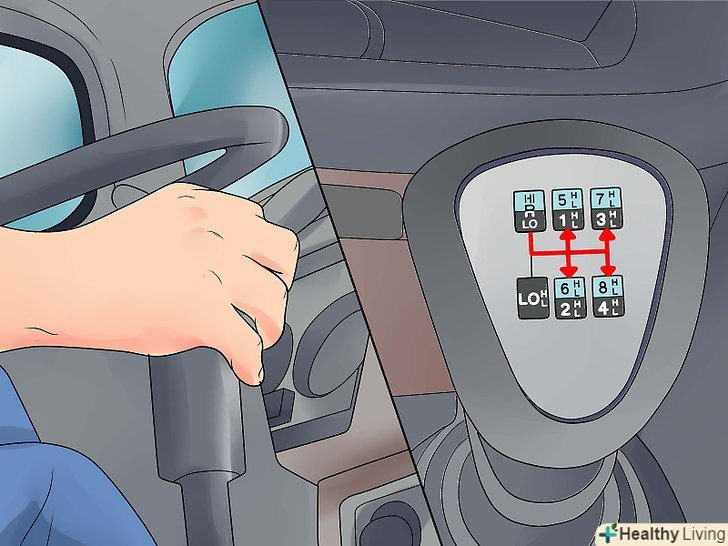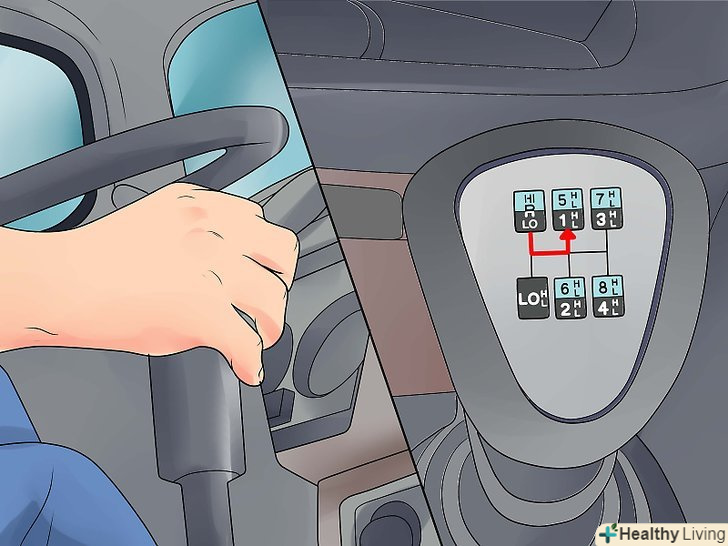 Попрактикуйтесь перемикати передачі за схемою, коли тягач не заведений.це дозволить вам ознайомитися зі схемою передач, так ви зможете перемикатися вперед і назад, не дивлячись. Це допоможе вам безпечно дивитися на дорогу під час водіння.- Візьміться за рукоятку перемикання передач так, щоб великий палець міг натиснути кнопку розподільника, а середній і вказівний пальці могли перемикати кнопку «Низькі/Високі» (передачі)..