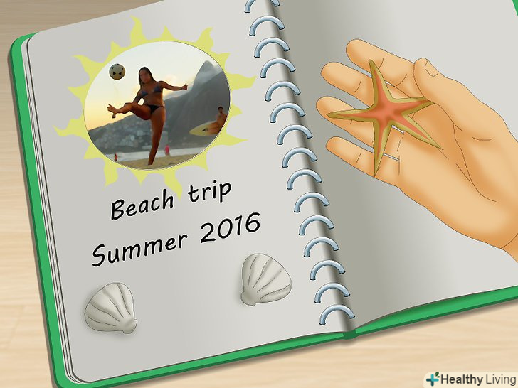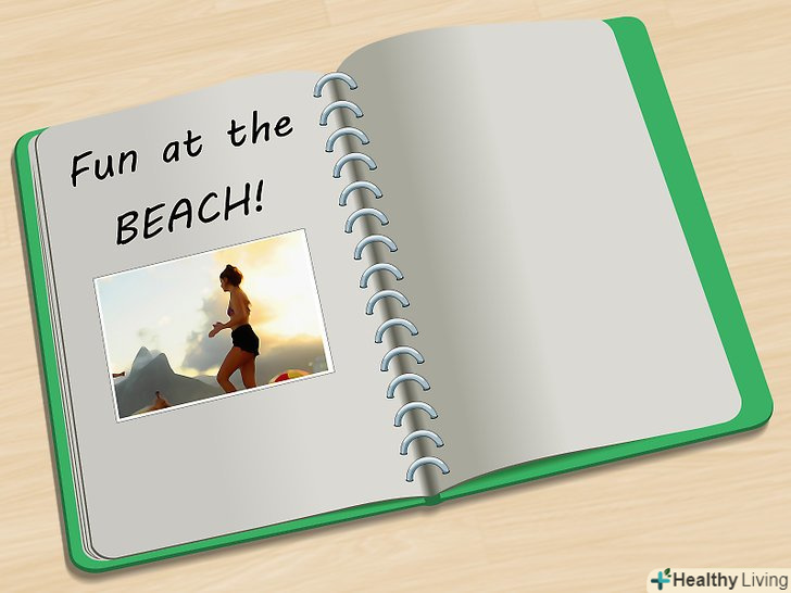 - Можливо, ви також вирішите чимось прикрасити альбом. Прикраси можуть мати пряме відношення до теми або змісту альбому, наприклад, це можуть бути вирізані вами Сніжинки для альбому про зимові канікули або різнокольорові листя для альбому про початок навчального року. Також можна використовувати прикраси виключно в декоративних цілях, наприклад, блискітки і стрази, які можуть не мати прямого відношення до теми пам'ятного альбому.