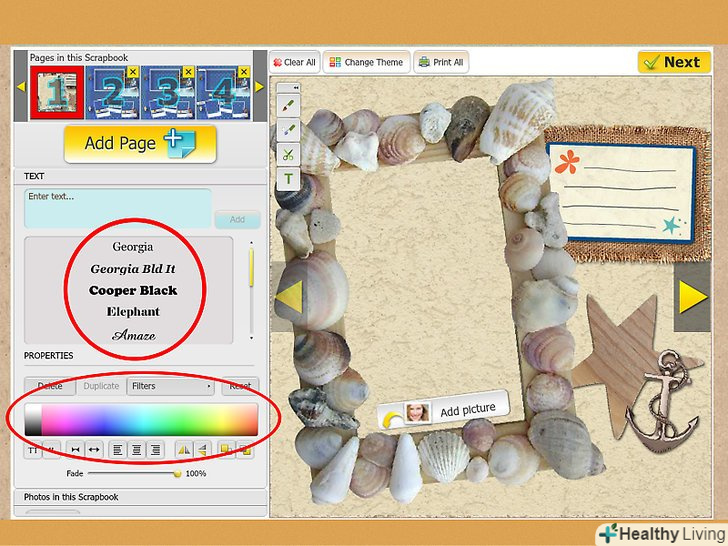 Виберіть однаковий стиль оформлення альбому. незважаючи на те, що це не критично необхідно, вибір конкретного шрифту (або набору шрифтів) і колірної схеми, які будуть використовуватися у всьому альбомі, дозволять вам надати йому більш професійний вигляд. Допустимо використовувати текст різного шрифту, кольору і розміру, якщо він використовується для різних цілей. Наприклад, текст, складений великими великими літерами, можна використовувати в заголовках, а звичайними малими літерами оформляти підписи до фотографій.- Виберіть таку колірну схему альбому, яка відповідає його темі. Наприклад, пам'ятний альбом про навчання в старших класах середньої школи можна створити в тонах емблеми вашої школи.