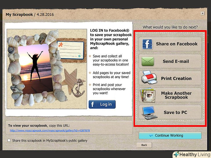 - Також існують програми, шаблони і веб-сайти, призначені для створення альбомів, більш наближених до традиційних, які потім можна роздрукувати на фізичному носії. Вони дозволяють вибирати розмір і формат пам'ятного альбому, а також розташування фотографій і тексту на сторінках тим же чином, як це можна зробити з традиційними пам'ятними альбомами. Нерідко можливість створення цифрового альбому доповнюється можливістю замовлення його роздруківки та створення фізичної професійно переплетеної копії. [6] навіть якщо ви вирішите залишити альбом в цифровому вигляді, можна буде відкрити загальний доступ до файлу з ним.