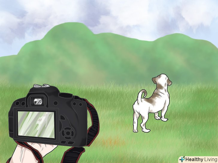 Зробіть вихованця єдиним об'єктом на фотографії. підійдіть близько до тварини, щоб воно зайняло собою весь простір кадру. Завдяки цьому фокусним об'єктом знімка стане саме вихованець, а не щось цікаве на задньому плані. [8]- По можливості розташуєтеся на одному рівні з вихованцем. Приляжте на підлогу або присядьте. В якості додаткового бонусу, можливо, ваш вихованець вирішить попрямувати до вас, щоб з'ясувати, що відбувається.