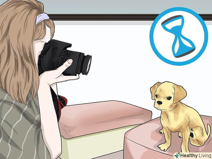 Працюйте короткими сесіями, щоб підтримувати інтерес вихованця. Думайте про вихованця як про маленьку дитину, тоді Ви отримаєте досить точне уявлення про те, наскільки довго вихованець здатний зберігати концентрацію уваги. Робіть перерви в процесі фотозйомки і знімайте тільки по парі кадрів за раз — так ви отримаєте фотографії з більш щасливим і зацікавленим тваринам. [11]- Налаштуйте для себе таймер на пару хвилин, якщо ви забуваєте робити перерви в роботі.