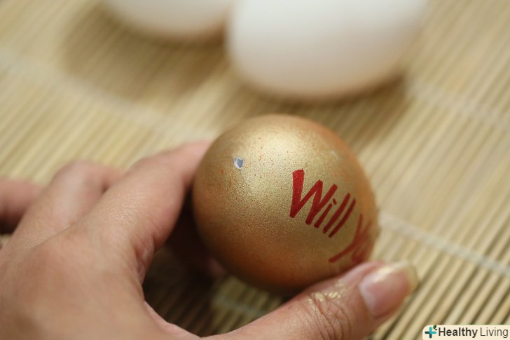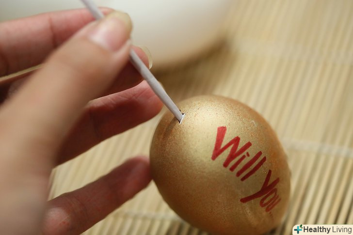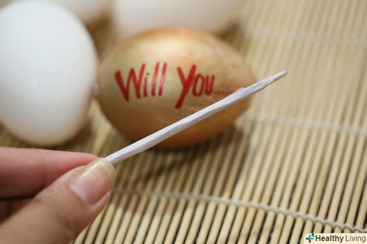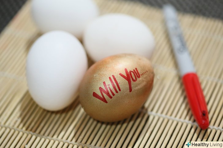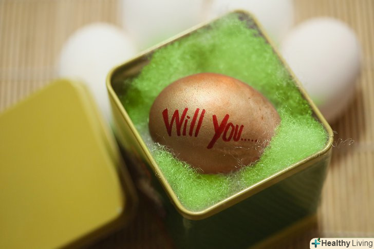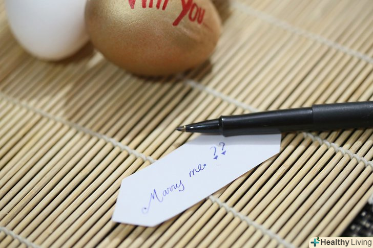 Розфарбуйте шкаралупу яйця. застосуйте креативність в оформленні, залиште натяк зовні. Наприклад, можна написати на шкаралупі:" згодна ти... "(а в самому посланні: "вийти за мене заміж?”).- Перед тим, як покласти всередину своє послання, дочекайтеся повного висихання фарби (в іншому випадку ви ризикуєте зіпсувати оформлення яйця і саму записку).