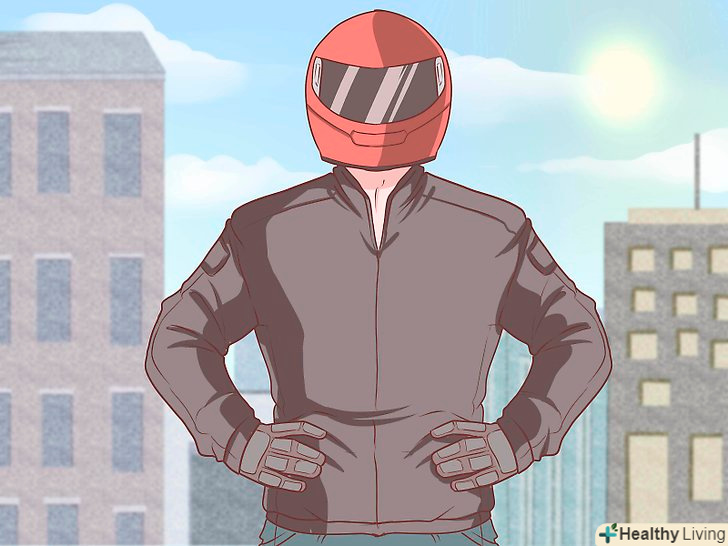 Використовуйте захисну екіпіровку.завжди одягайте шолом, щільну куртку, штани і спеціальні рукавички, навіть якщо ви пасажир. Людина на мотоциклі вразлива, а захисне спорядження знизить ризик травм і може навіть зберегти вам життя, якщо ви потрапляєте в аварію.[9]- Шолом знижує ризик смерті від травми голови на 40%.