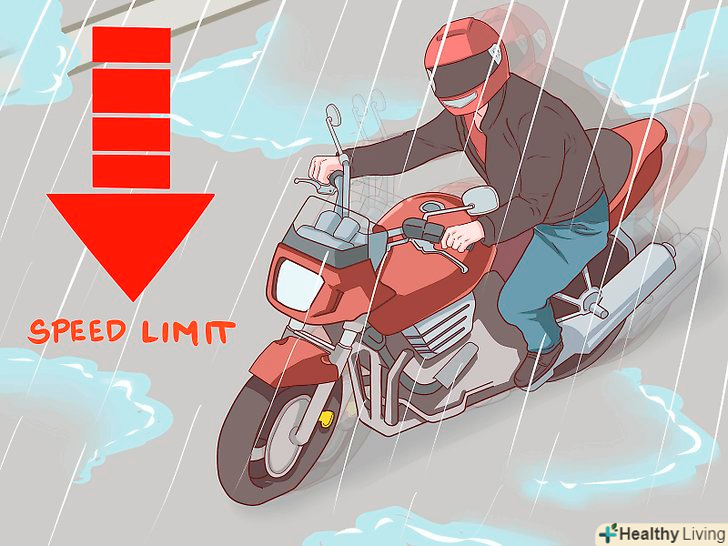 При русі враховуйте погодні та дорожні умови.у погану погоду керувати мотоциклом складніше, особливо якщо на дорозі погана видимість або опади. Швидко загальмувати на мокрій дорозі складно, що підвищує ризик аварії.- У погану погоду обмежуйте швидкість. Це дозволить вам швидше відреагувати на несподіванки на дорозі і зупинитися або сповільнитися.