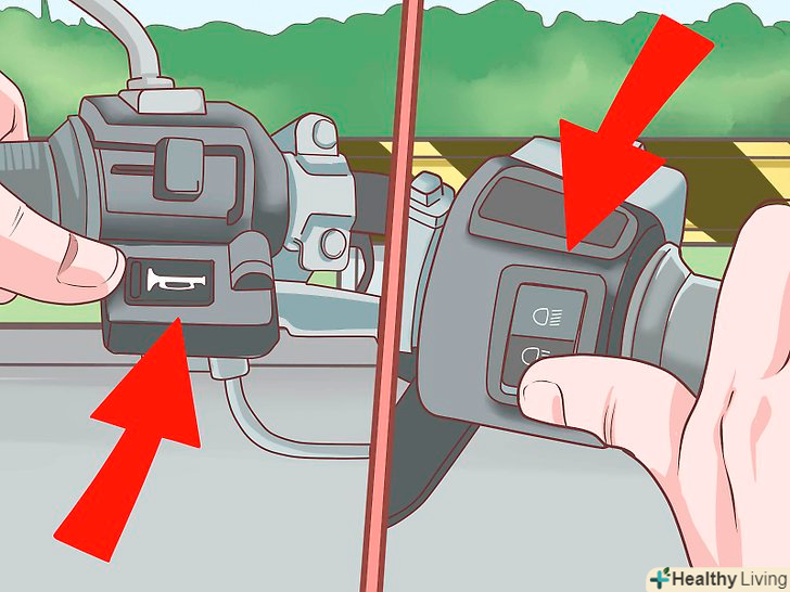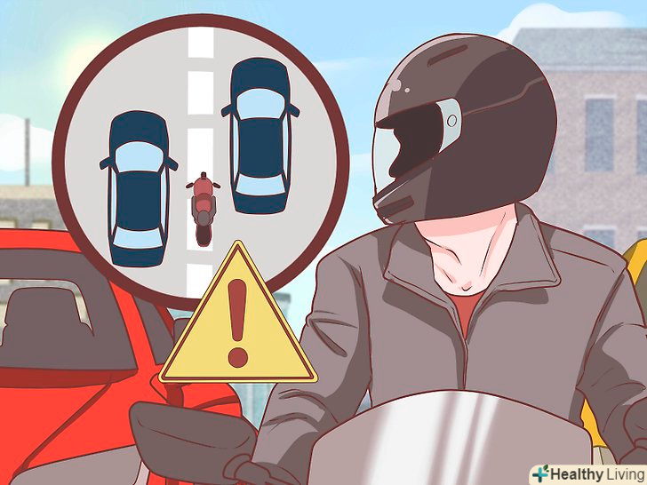 Поводьтеся обережно і будьте напоготові.багато аварій за участю мотоциклів відбуваються через надмірно агресивного водіння. Водієві машини складно помітити мотоцикліста. Якщо машина різко перебудується або поверне, це може привести до зіткнення з мотоциклом.[15]- Використовуйте клаксон і фари. Щоб вас бачили, не бійтеся користуватися клаксоном і фарами при наближенні інших транспортних засобів. Якщо ваші фари завжди будуть горіти, ви будете помітніше на дорозі.