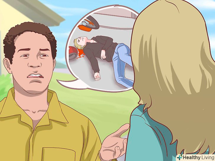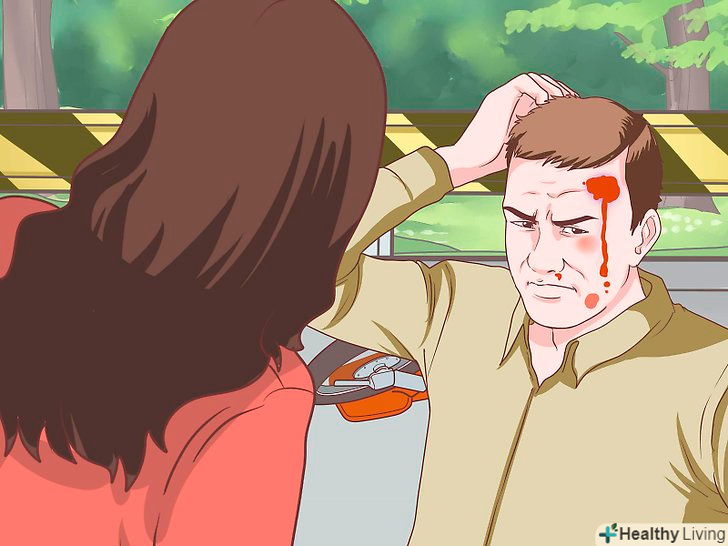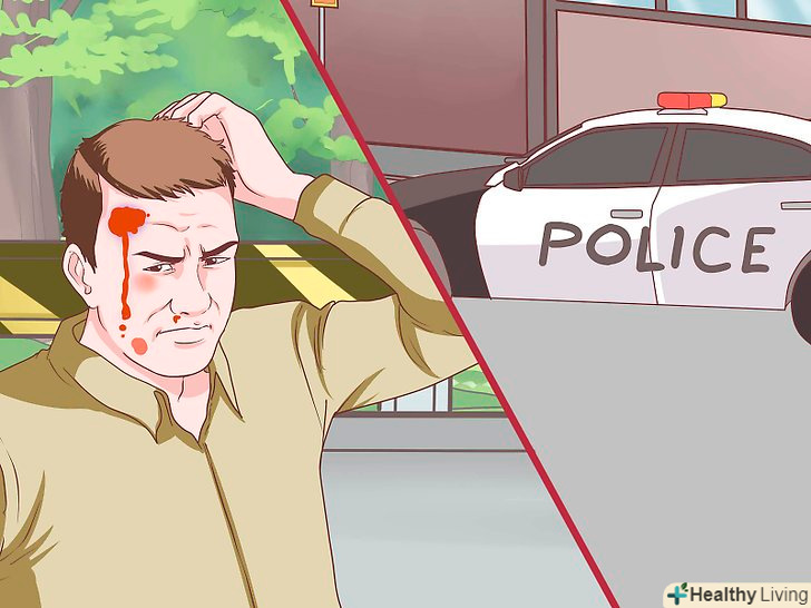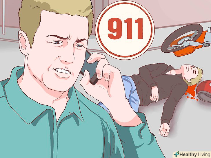 Перевірте, чи травмовані ви або хтось ще.викличте швидку допомогу, якщо комусь потрібен лікар. Мотоциклісти рідко відбуваються легкими забоями, а багато більш серйозні травми стають очевидними не відразу. Тому викличте швидку навіть в тому випадку, якщо вам здається, що з вами все в порядку.[1]- Більш серйозними вважаються травми грудей і живота, хоча в результаті зіткнень на мотоциклі вони бувають рідше, ніж травми кінцівок.[2] через тупих ударів в область живота і грудей можуть постраждати внутрішні органи. Це також небезпечно можливими внутрішніми кровотечами.