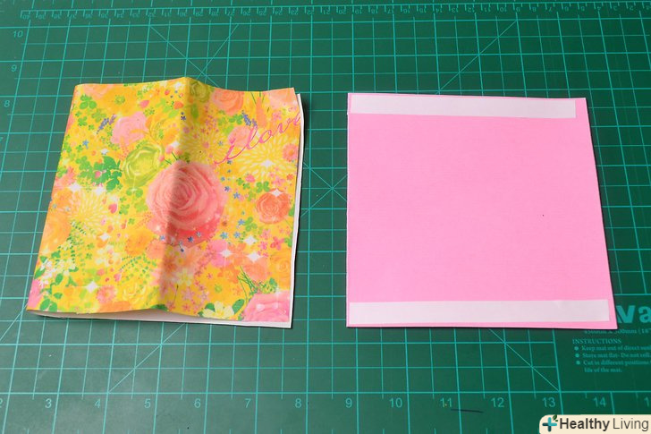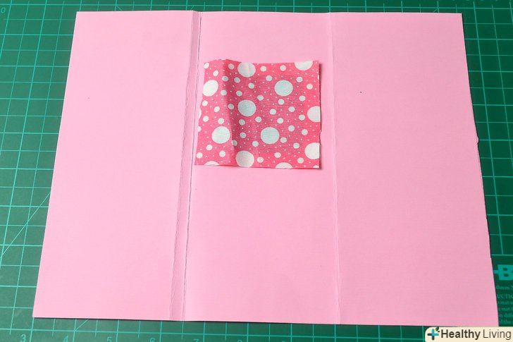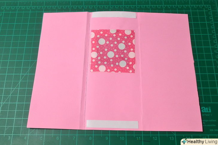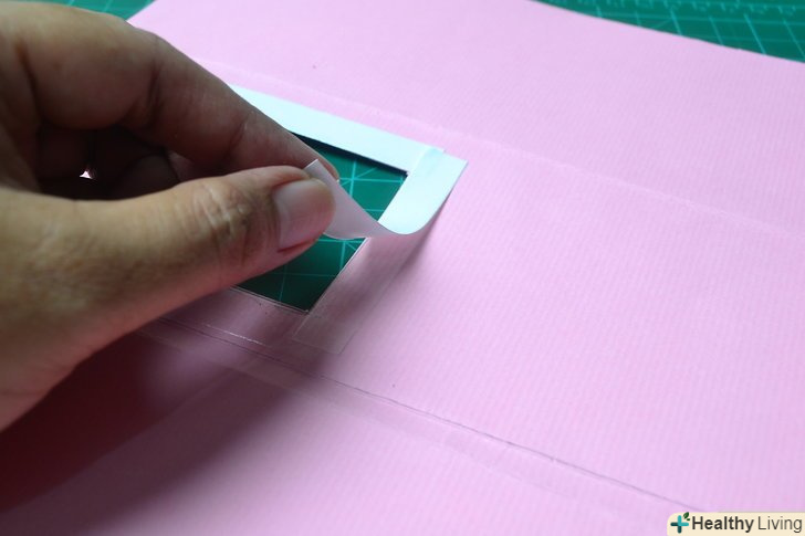Прикріпіть предмет за допомогою подвійного скотча по кутах або по краях. складіть бічні сторони листівки, щоб скотч гарненько приклеївся.- Тепер ваш предмет знаходиться між двома смужками листівки, а середня її частина стала лицьовою. Ліва сторона листівки повинна стати внутрішньою лівою частиною вашого виробу.