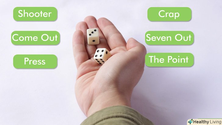 Вивчіть терміни. Ви швидше навчитеся правилам гри, якщо не будете кожен раз просити роз'яснень при кожній згадці чого-небудь на зразок поінта або крепса. Вивчивши основні поняття ви швидше навчитеся грі:- Кидаючий гравець гравець, що кидає кістки (кожен раз різний)