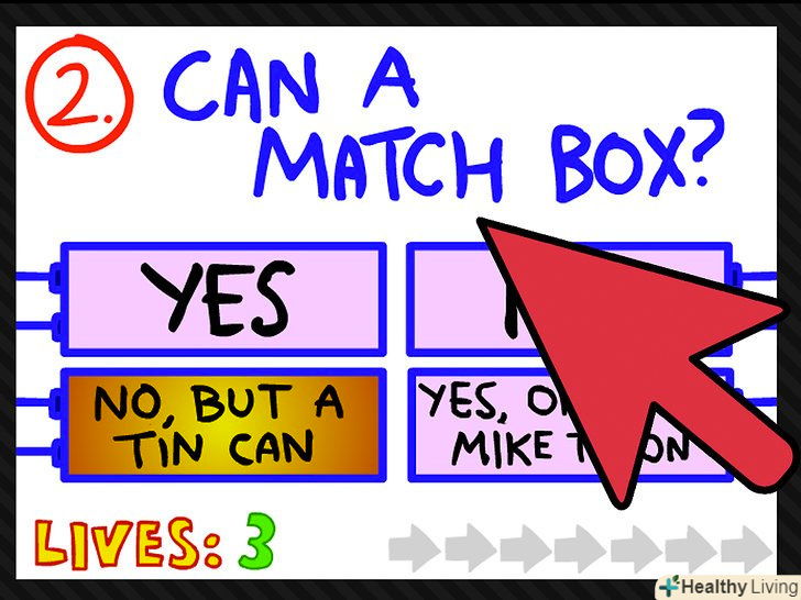 Виписуйте неправильні відповіді і здогадки. якщо ви не знаєте відповідь напевно і відповідаєте по інтуїції, то, перш ніж відповісти, Запишіть свій варіант. Якщо відповідь виявиться невірним, то викресліть його, якщо вгадали – обведіть. Якщо ви втратите всі життя, і вам доведеться починати все спочатку (а буде дивом, якщо ви пройдете вікторину з першого разу), ви похвалите себе за те, що ви робили позначки, граючи в минулий раз, адже в новій грі вам доведеться вибирати серед меншої кількості варіантів відповіді.