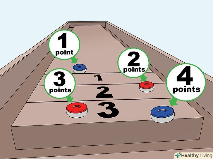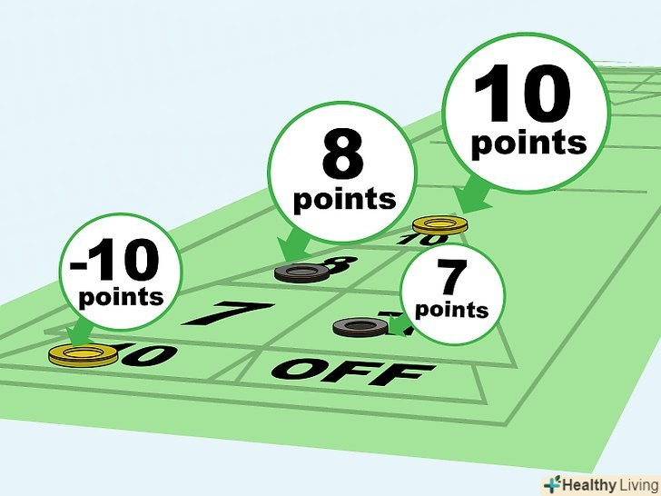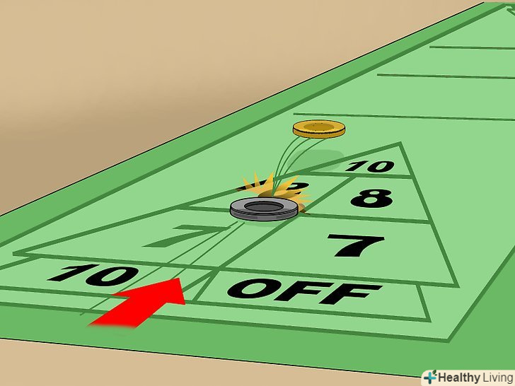 Заробляйте очки. звішується з далекого кінця столу диск коштує три очки, диск, що потрапив на або перетнув далеку лінію, приносить два очки, диск, який опинився на або перетнув ближню лінію, коштує одне очко. Якщо жоден з дисків не перетнув лінію, то за найближчий до неї диск дається одне очко. Складайте очки гравців з їх попередніми очками. [7]