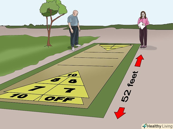 Зберіть гравців на корті для шаффлборда. для шаффлборда на відкритому повітрі використовується корт довжиною 52 фути (15,6 м) прямокутної форми з трикутними заліковими майданчиками з обох сторін. [3]