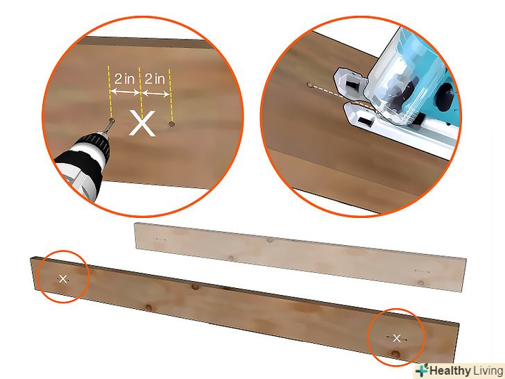 Зробіть 10 см паз у кожної з відміток двох дощок 5 х 25. це дозволить деревам гойдатися на вітрі, не ламаючи будинок. Зробити паз можна, просвердливши 2 отвори на ~17 см, в 5 см від позначки з обох сторін. Потім пропиляєте лобзиком між отворами, створивши паз на 10 см, відцентрований строго по вашій позначці.- Таким чином, коли дерева будуть рухатися на вітрі, платформа будинку також буде злегка розгойдуватися. Але якби вона була намертво прикручена до дерева, то вона б гойдалася разом з ним, що не пройшло б для неї безслідно.