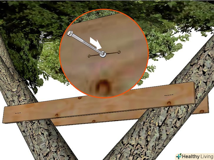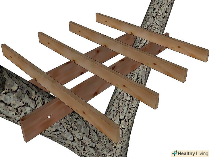 Встановіть дві основні підтримуючі планки на дереві на відповідній висоті. Вам будуть потрібні дві міцні балки 5 х 25 (5 х 30 теж зійдуть); впритул прикріпіть їх до дерева на 4 болта на 15 або 20 см за допомогою гайкового ключа. Між дошкою і болтом покладіть Шайби. Закріпіть другу балку аналогічним чином на протилежній стороні дерева.- Заздалегідь просвердлите в дереві і балках отвори, так буде простіше кріпити балки.