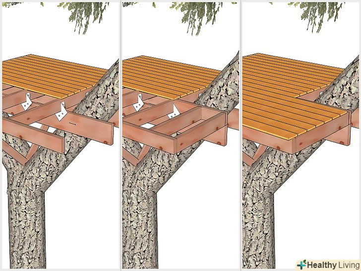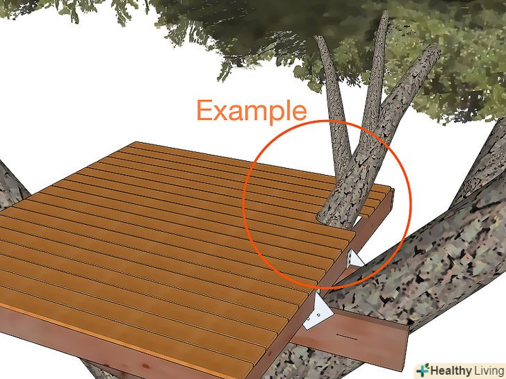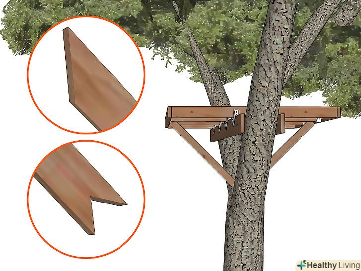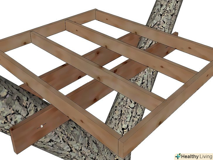 Закріпіть платформу за допомогою балок 5х10. у такому вигляді, як вона є зараз, платформа дещо хитка. Щоб зробити її більш стійкою, потрібні будуть мінімум 2 балки 5 х 10, які будуть прикріплені до нижньої частини дерева і закріплені на обох кінцях платформи.- Верхні кінці кожної з балок 5 х 10 обріжте під кутом в 45 градусів, щоб ви могли прикріпити їх всередину самої платформи.