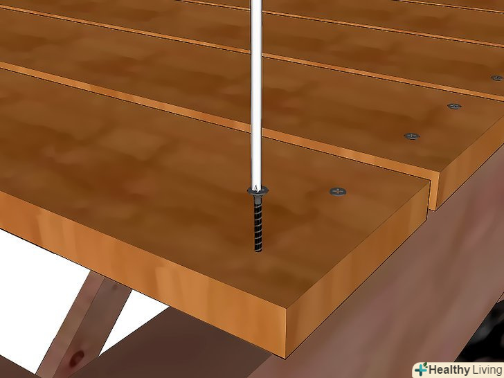 Закріпіть кожну дошку підлоги з обох кінців болтами на 10 см. коли дошки для підлоги готові, їх треба прикріпити до платформи. Так що беріть-но сходи, дриль і вперед, кріпите підлогу. Між дошками підлоги можна залишати по ~ 1 сантиметру.