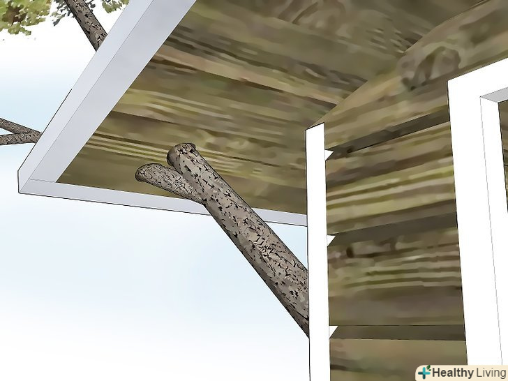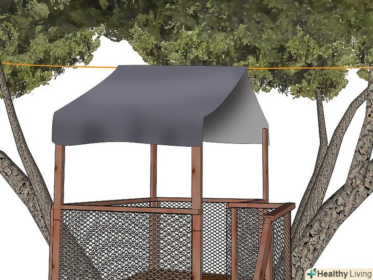 Зробіть дах для будинку на дереві. згодиться хоч брезент, хоча можна і дати волю фантазії. Встановлювати дах слід на висоті мінімум 2.5 метра від платформи. У випадку з брезентом можна використовувати натягнуту між двома гаками мотузку як опору.- Інший варіант: зробіть 4 виносні опори певної висоти і розмістіть їх на 4 кутах огорожі. Прибийте до них брезент, причому через шайбу. Так дах буде висіти рівніше.