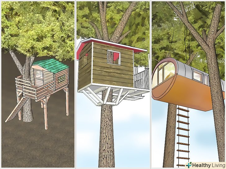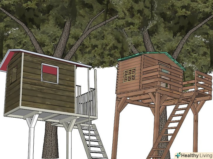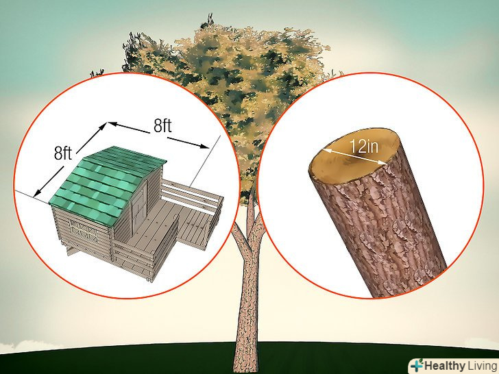 Виберіть дерево. якщо ви будуєте будинок на дереві на задньому дворі, то ваш вибір обмежений, власне кажучи, кількістю зростаючих там дерев. Вибрали здорове дерево? Добре, тепер починайте думати, який будинок побудувати. Втім, можна вчинити і навпаки, і спершу намалювати проект, а потім вже шукати відповідне дерево. І ось про що слід пам'ятати:- Для стандартного будинку на дереві 2,5 х 2,5 м стовбур повинен бути мінімум 30 см в діаметрі.
