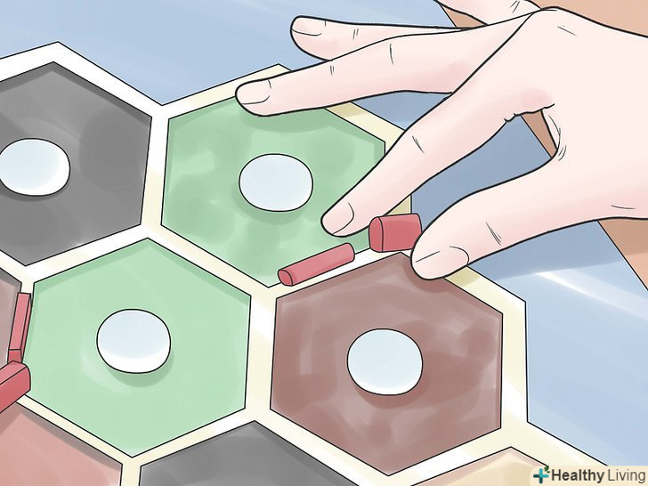 Поставте перші поселення. спочатку потрібно будувати села, їх можна ставити тільки на перетину шестикутників. Після цього ви зможете отримувати ресурси з шестикутників, які знаходяться навколо вашого поселення. Далі черга переходить до наступного гравця за годинниковою стрілкою.- Дороги завжди ставляться в місця, де зустрічаються сторони двох шестикутників, дороги можуть йти тільки з поселення.
