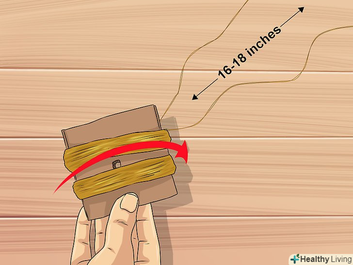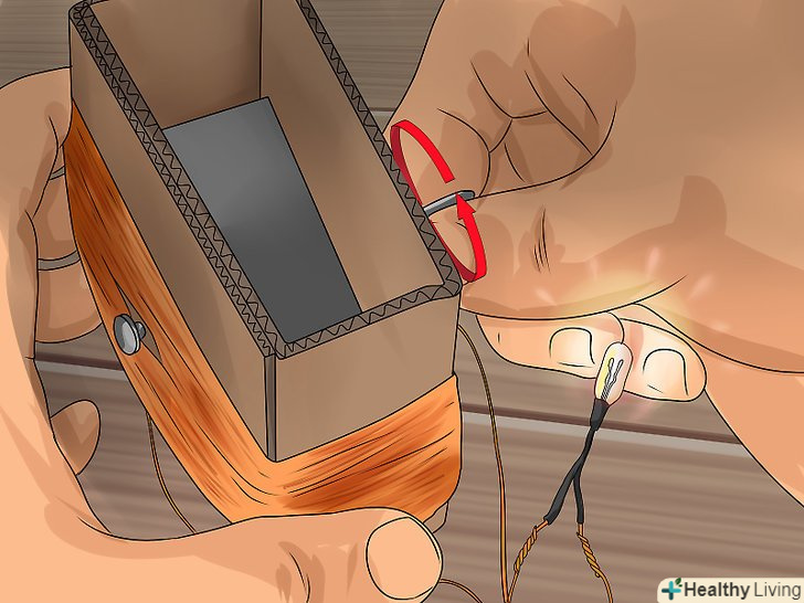 Намотайте мідний дріт.зробіть пару сотень обертів емальованого (обмотувального) мідного дроту (магнітного дроту №30) навколо картонного каркаса. Намотайте на каркас приблизно 60 м дроту так щільно, як зможете, залиште вільними по 40-45 см дроту з обох кінців намотування, щоб потім підключити до них мультиметр, лампочку або інший електричний прилад. Чим більше витків обмотки ви зробите, тим потужніше вийде генератор.[5]