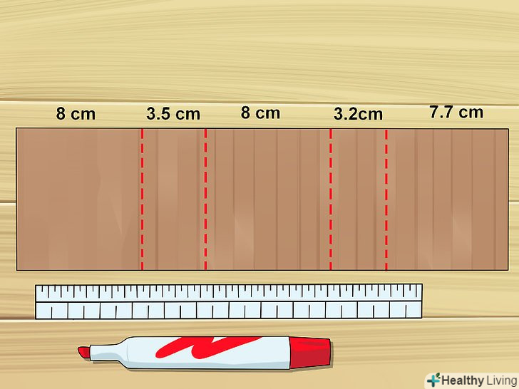 Розмітьте картон.візьміть лінійку і нанесіть мітки вздовж картонної смуги. Першу мітку поставте в 8 см від краю смуги, другу – в 11,5 см, третю – в 19,5 см, а останню – в 22,7 см.[2]- Так у вас вийдуть сегменти розміром 8 см, 3,5 см, 8 см, 3,2 см і 7,7 см.не розріжте картон по мітках.