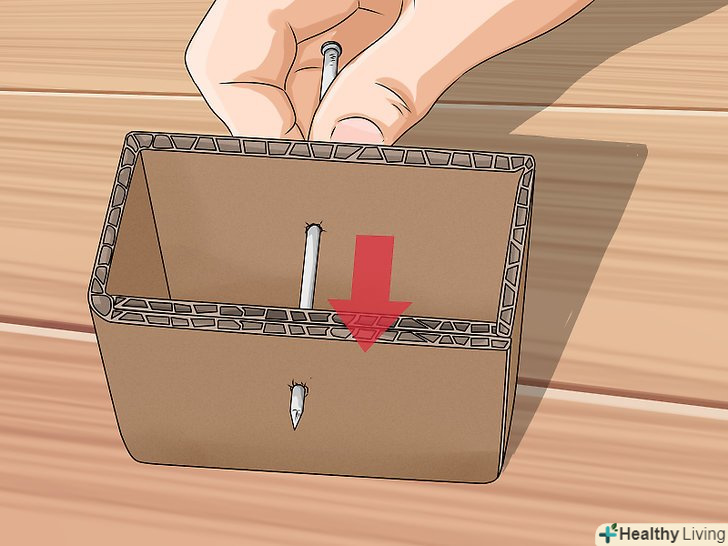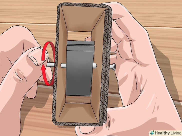 Проведіть через центр каркаса металеву вісь.проткніть картонний каркас цвяхом. При цьому вам буде потрібно проткнути відразу три шари складеного картону. Так ви підготуєте отвір для осі генератора. Потім можна вставити в підготовлений отвір вісь або залишити в якості осі раніше використаний цвях.[4]- До металевої осі не пред'являється якихось особливих вимог. Вам підійде будь-яка металева вісь, яка пролізе через отвір в каркасі і буде досить довгою, щоб нанизати його на себе цілком. Використаний для виготовлення отвору цвях також може стати ідеальною віссю.