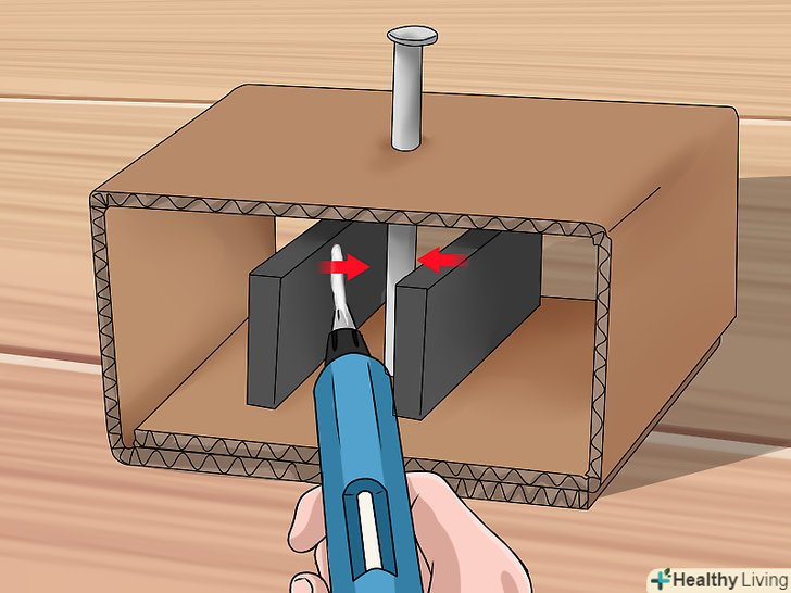 Приклейте магніти до осі.використовуйте гарячий клей сильної фіксації або епоксидний клей, щоб наклеїти на вісь чотири керамічних магніту. Магніти повинні бути нерухомі по відношенню до осі. При цьому магніти приклеюються на неї вже після того, як вона буде вставлена в каркас. Дайте клею кілька хвилин на те, щоб застигнути (в інструкції на упаковці вказано конкретний час очікування).[8]- Для найкращих результатів використовуйте Керамічні магніти розміром 1x2x5 см (їх можна знайти онлайн за розумною ціною). Приклейте магніти таким чином, щоб два з них були звернені до котушки намотування північними полюсами, а ще два – південними.