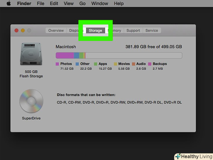 Клацніть по вкладціНакопичувач.вона знаходиться у верхній частині вікна "про це Mac".