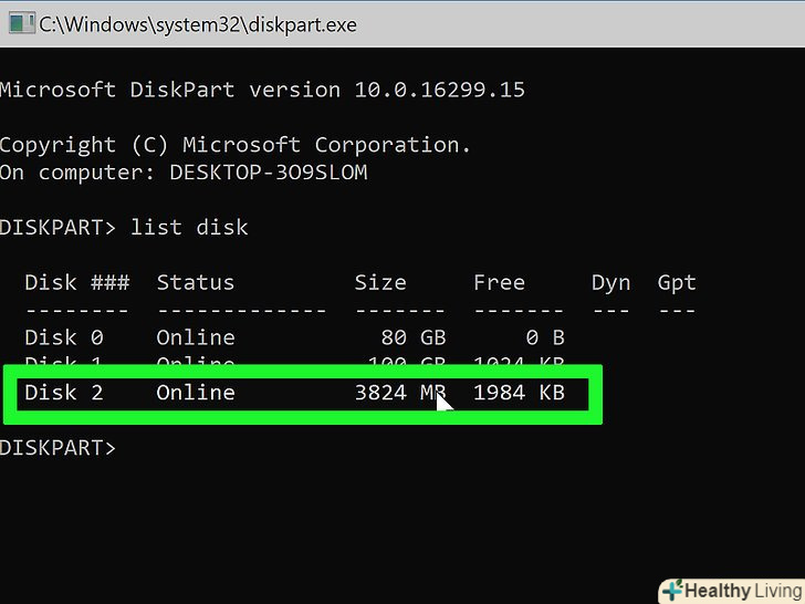Визначте номер SD-карти.SD-карту можна знайти по ємності носія, яка відображається в стовпці "розмір«; число, яке знаходиться праворуч від» Диск", є номером SD-карти.- Наприклад, якщо ви бачите, що ємність Диска 3 дорівнює ємності вашої SD-карти, номер вашої SD-карти дорівнює 3.