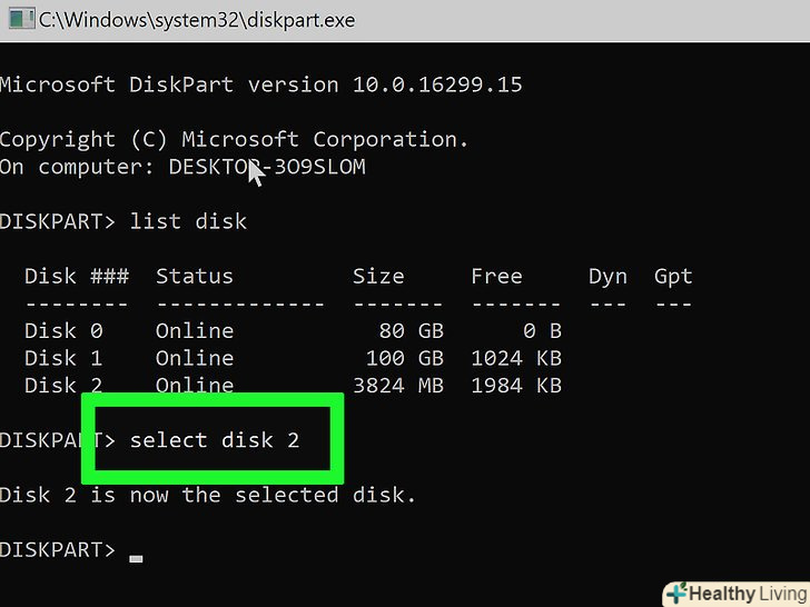 Виберіть SD-карту. Введіть select disk # , де замість # підставте номер SD-карти, а потім натисніть ↵ Enter. Тепер утиліта DiskPart буде працювати з вашою SD-картою.- Наприклад, якщо ваша SD-карта позначена як «Диск 3» у списку підключених дисків, введітьselect disk 3.