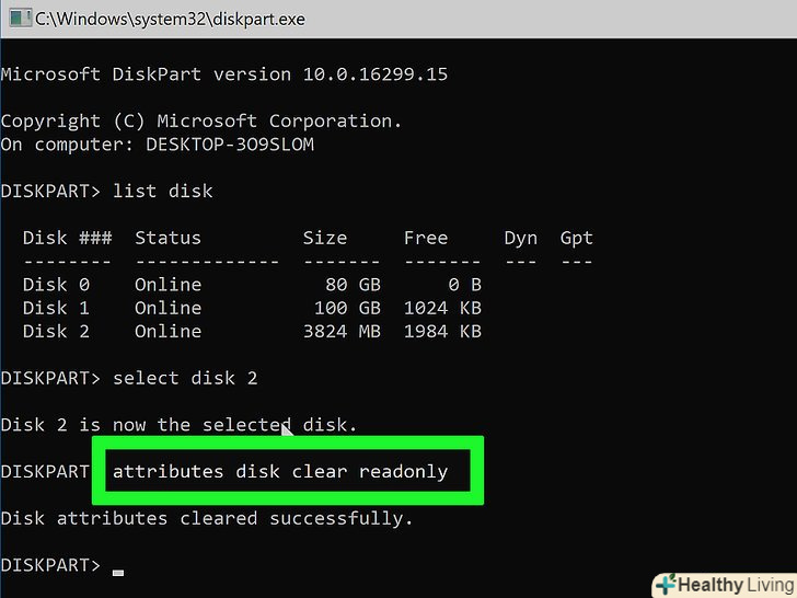 Видаліть атрибут "тільки для читання". Введіть attributes disk clear readonly натисніть ↵ Enter. Відобразиться повідомлення " Disk attributes cleared successfully» (атрибути диска видалені), тобто тепер на SD-карту можна записувати файли.