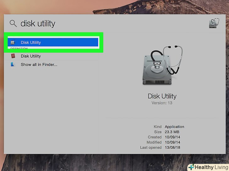Відкрийте дискову утиліту. введітьДискова утиліта в рядку пошуку, а потім двічі клацніть по «Дискова утиліта» в результатах пошуку.