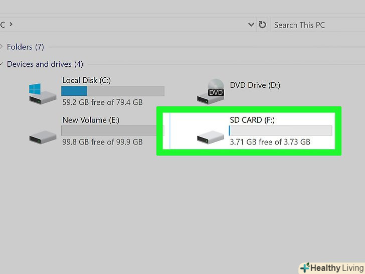 Підключіть SD-карту до комп'ютера.якщо на комп'ютері є пристрій для читання SD-карт, вставте в нього карту (етикеткою вгору і золотими контактами вперед).- Якщо на комп'ютері немає пристрою для читання карт пам'яті, вам знадобиться адаптер USB-SD-карта.