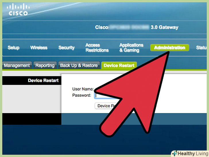 Зайдіть на сторінку налаштувань модему.хоча кожен модем має свої незначні відмінності, у них всіх є вкладка «Налаштування» або «управління», на які можна зайти, володіючи доступом адміністратора мережі. Ця вкладка повинна автоматично з'явитися в браузері. Тут також повинна знаходитися опція перезапуску модему з»заводськими настройками".[5]